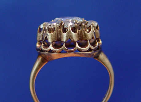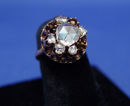 ROSE CUT DIAMOND: Measuring approx. 7.3 x 7.3 x 1.2, set with five (room for 8) small mine cut diamonds in 14k gold ring (three empty holes), unable to measure small stones due to mounting. Size 4, approx. 4 grams.