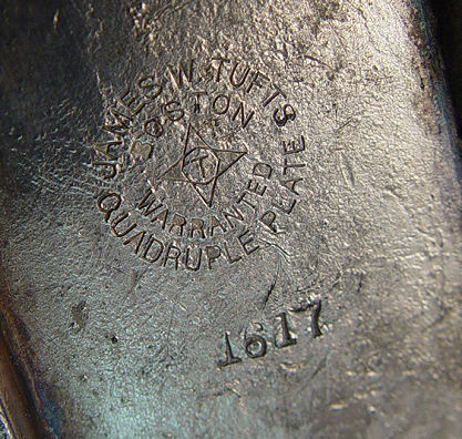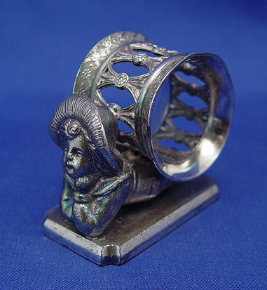 TUFTS SILVERPLATED KATE GREENAWAY FIGURAL NAPKIN RING: Signed James W.Tuff, Boston. #1617 Approx.2 1/2'' h. Very slight dent on the reticulated ring.