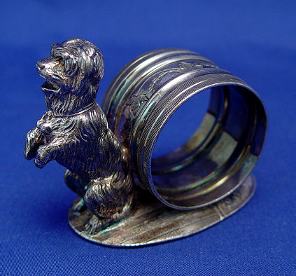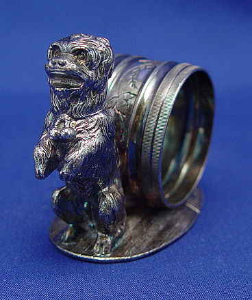 MANNING BOWMAN BEGGING PUPPY FIGURAL NAPKIN RING: Dog on hind legs, 2 1/4''.
