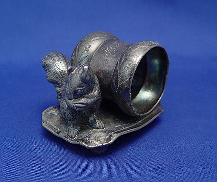 VICTORIAN SILVER PLATED NAPKIN RING WITH FIGURE OF SQUIRREL: Signed Wm.Rogers Mfg Co., Hartford, Conn. Monogrammed NEM. 2 1/4''h. Slight dent.