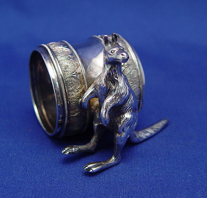 VICTORIAN SILVER PLATED KANGAROO FIGURAL NAPKIN RING: No makers marks, 2''h.