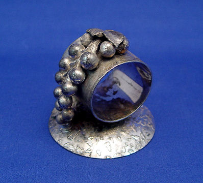 VICTORIAN GRAPE FIGURAL NAPKIN RING: Acme Silver Co. of Toronto. Embossed floral base. 3''h.