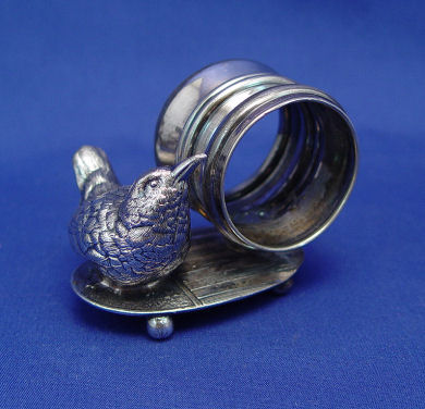 ROGERS & BRO BIRD FIGURAL NAPKIN RING: On ball feet, Rogers fist mark. 2 1/4''h.