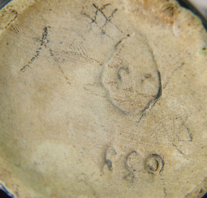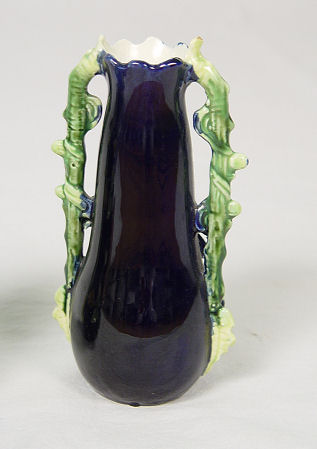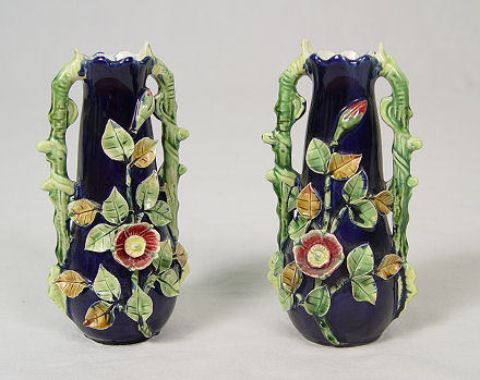 PAIR OF MAJOLICA VASES: Applied floral decoration, branch type handles, cobalt ground. Probably German. 6 3/4''h.