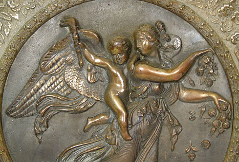EMBOSSED CAST IRON FIRE PLACE SURROUND AND SCREEN: Overall bronzed patina, surround, decorated with floral and ribbon design, measures approximately 30 1/4'' x 30 1/4'' overall, opening measure 22'' x 22''. The screen, embossed with flowers and ribbons, measures 22 1/2'' x 22'' (please note repair) and has a removable circular piece currently bolted in place decorated with embossed angel and cherub. The cherub is holding a torch and the angel is holding cascading flowers, circular portion is 17 1/2 dia.