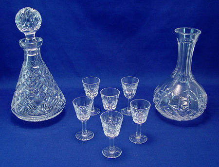 TWO WATERFORD CRYSTAL DECANTERS AND SIX CORDIALS: Includes a Waterford Lismore decanter and 6 cordials. sold with a Waterford decanter cut in a diamond pattern with cut stopper.