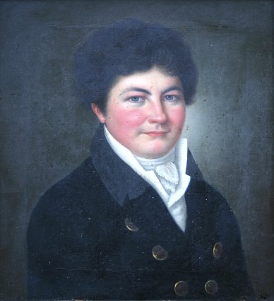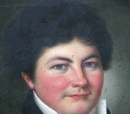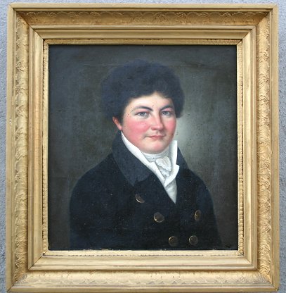 19TH CENTURY PORTRAIT OF A GENTLEMAN, O/C: 10 1/4'' X 9 3/4'', encased in a period embossed floral leaf and berry motif, 13 1/2'' x 12 3/4'', no signature visible. Condition - Stretcher wear, slight paint fleck, heavy nicotine stains, needs cleaning.
