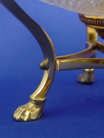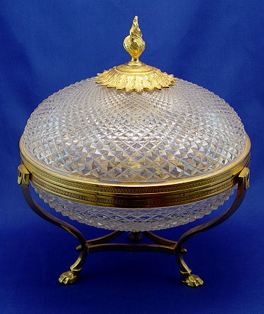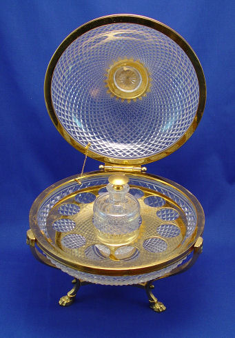 CUT CRYSTAL LIQUEUR BOX: Crystal cut in a diamond pattern. Gilt metal mounting includes flame finial and long legs ending in hoof feet. Hinged top. Interior fitted with removable holder for bottle and stems. The bottle is included. 13 1/2''h. overall. 11 1/2'' dia.