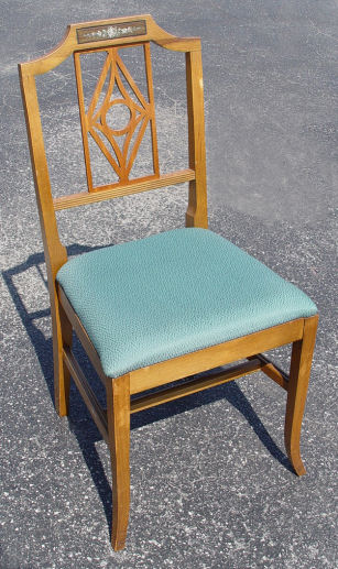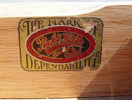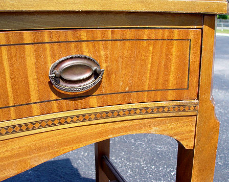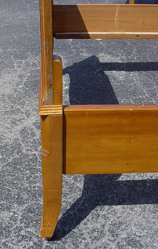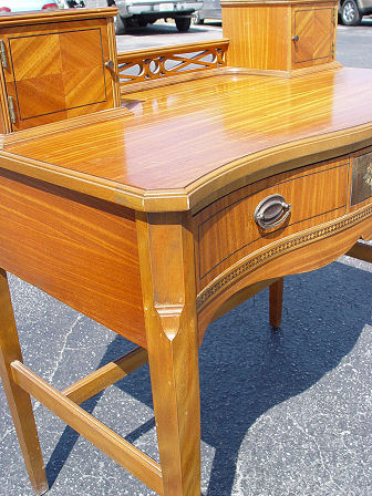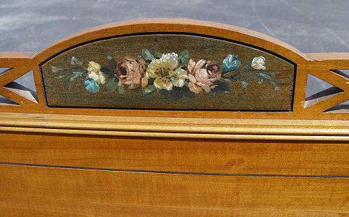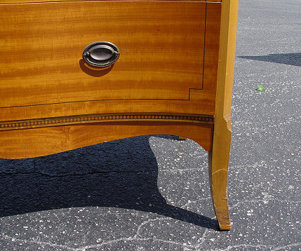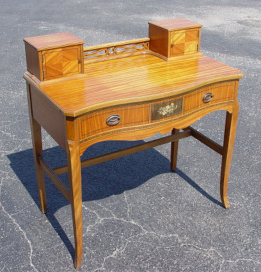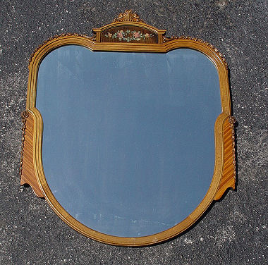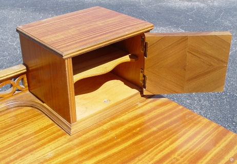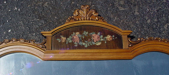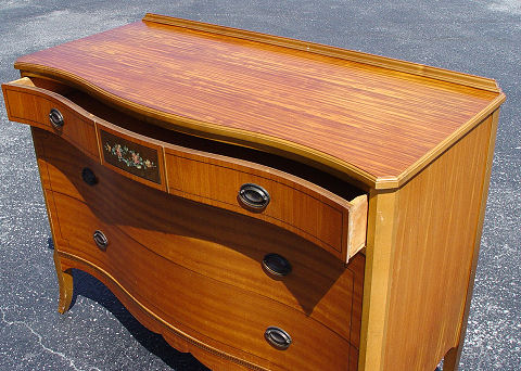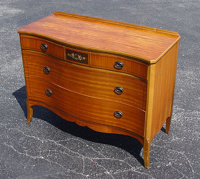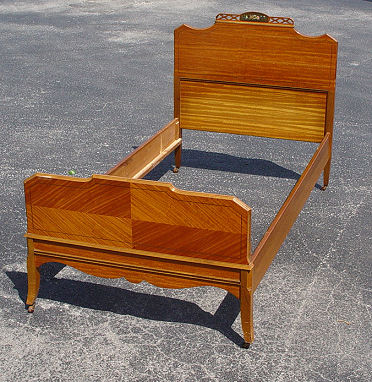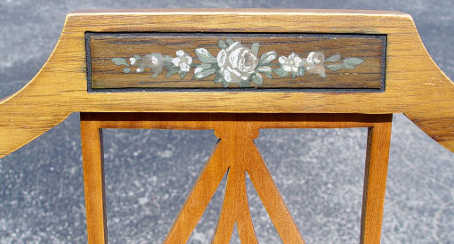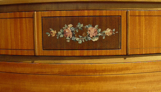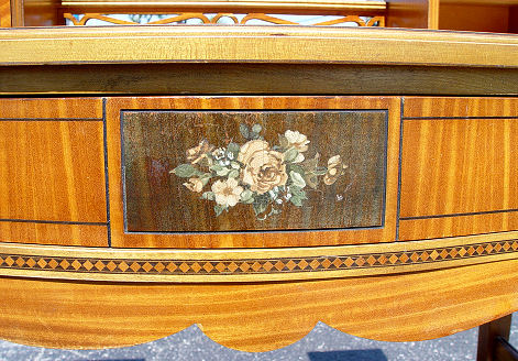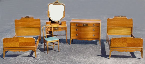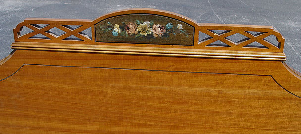 1930's STRIPED MAHOGANY PAINT DECORATED BEDROOM SUITE: To include pair of twin beds with 44''h. headboard, serpentine front dresser, 36''h. x 48''w. , serpentine front vanity, 35''h. overall, 34''w. x 19'', mirror, and chair. Each of the pieces have a hand painted floral medallion. Bears the label of Peck & Hills.