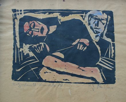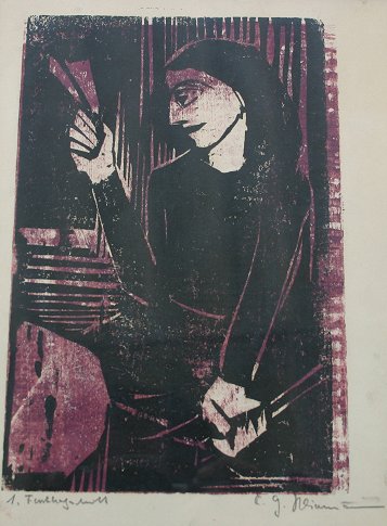 COLLECTION OF 3 DIE BRUCKE WOODBLOCK PRINTS: Two are illegibly signed and are color WoodBlock prints depicting figures, the first sight size is 7 1/2'' x 9 1/4'', pencil titled lower left, signed illegibly lower right, hole in upper margin and tear extending slightly into image in the lower right corner. The second by the same artist, depicts a girl reading, sight size 10'' x 8'', title in pencil lower left, illegibly signed lower right, good condition. The last piece is signed Karl Felzmann?, sight size measures 10 3/4'' x 7 3/4'', pencil signed lower right, titled lower left, numbered 7, depicts a female head. All three pieces are accompanied by an essay written by Catherine Wilkins who is a noted expert on the Die Brucke movement.