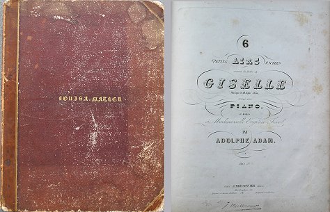 ORIGINAL ENGRAVED ENGRAVED SHEET MUSIC BOUNDED IN HARD COVER BOOK FORMERLY BELONGING TO LOUISA MATHER INCLUDES ORIGINAL SCORE FOR GISELLE BY ADOLPHE ADAM (1803-1856): Written and engraved in 1841, size of book 13 1/2'' x 10 1/2'', also includes books by Masini Hunten, Ponchard and others. Cover in worn condition, pages show staining and foxing, but good overall.