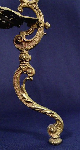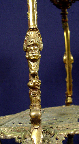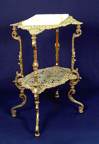 CHERUB DECORATED MARBLE TOP STAND: Diamond shaped marble set into an ornate, heavy brass stand decorated with masquerons and cherubs. 30''h. x 11'' x 18''