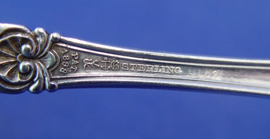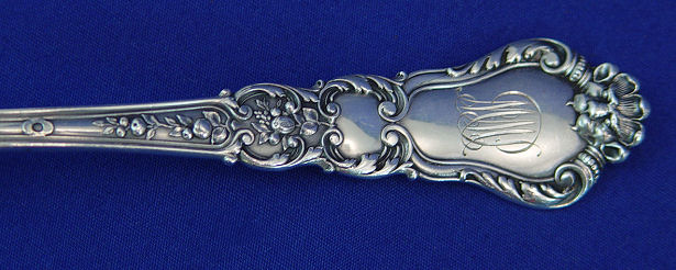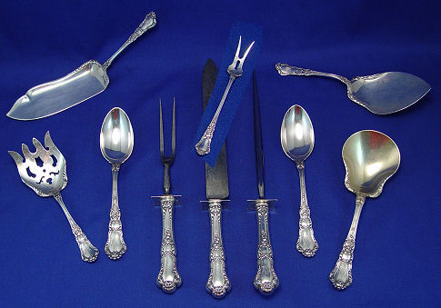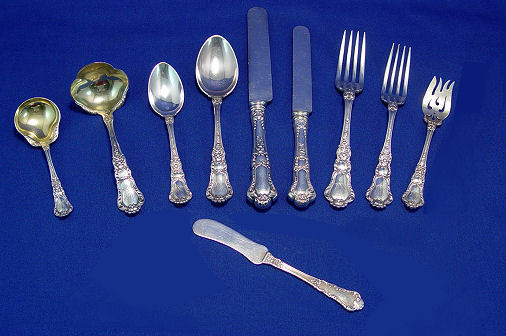 GORHAM ''OLD BARONIAL'' STERLING FLATWARE SERVICE: 63 pieces to include 6 each of dinner knives (9 1/2''), luncheon knives(8 1/2''), dinner forks (7 3/4''), luncheon forks (7''l), salad forks, teaspoons, butter spreaders, and vermeil bowl soup spoons. Also there are 2 serving spoons, a 3 piece carving set, crumb knife, casserole or berry server, fish fork, 6'' ladle, 4 tablespoons, and a large serving spoon, possibly a cracker server. Monogrammed, very good condition.