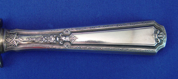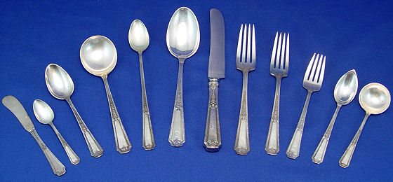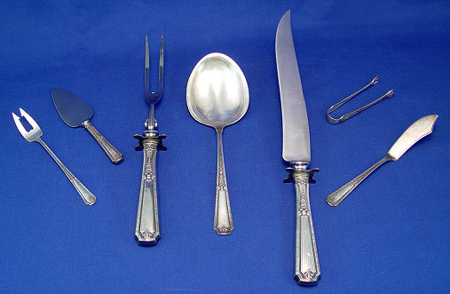 TOWLE ''LOUIS XIV'' STERLING FLATWARE 112 PIECE SERVICE FOR 8: To include 8 each of dinner knives (9 1/2''), dinner forks (7 3/4''), luncheon knives, luncheon forks, salad forks, soup spoons, bouillon spoons, iced tea spoons, orange spoons, demi-tasse spoons, butter spreaders, butter pick, master butter, sugar spoon, casserole or berry spoon, 2 5 o'clock spoons, 2 large serving spoons, and a two piece carving set. Monogrammed ''C''. Sold in the wood storage box. Est. $1200/1400**