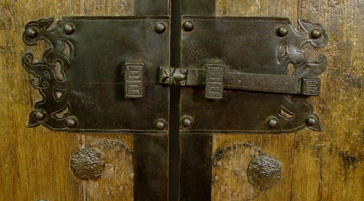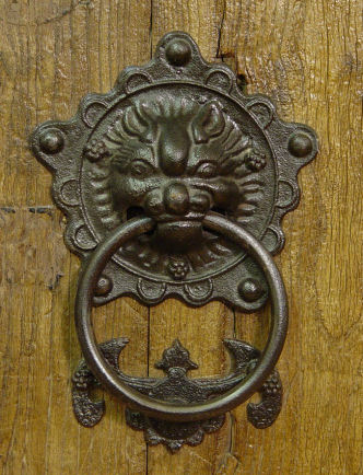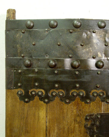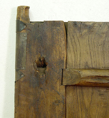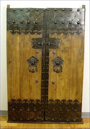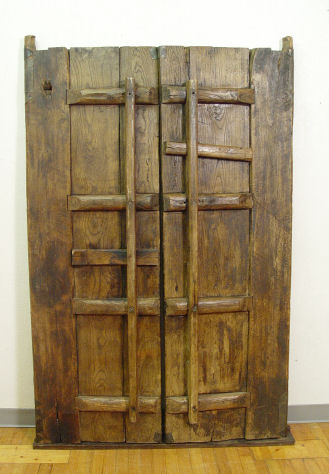 19TH CENTURY CHINESE EXTERIOR DOORS PURCHASED IN CHINA: Heavy wood and iron, each door is 71 3/7'' h. x 23 1/4''w. Ring nose lion head masqueron door knockers. Est. $1200/1500**