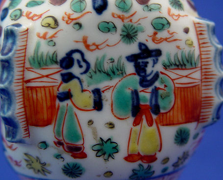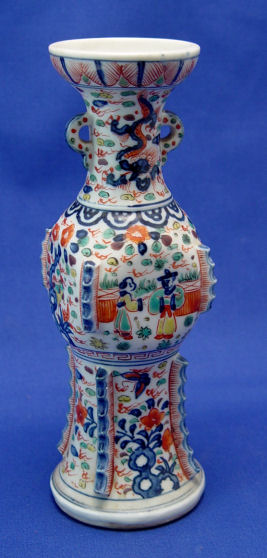 CHINESE POLYCHROME ENAMELED VASE: Showing people, floral and dragons. Handles at neck and four raised scalloped ridges at the sides. 9''h. Bears the blue underglaze rein mark of og Lung Ching, 1567-1572. Actual age unknown.
