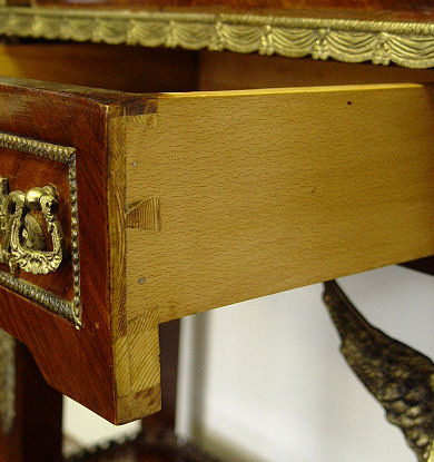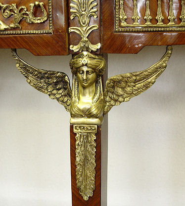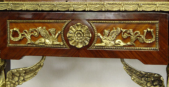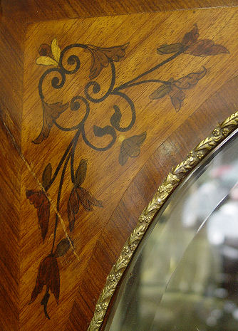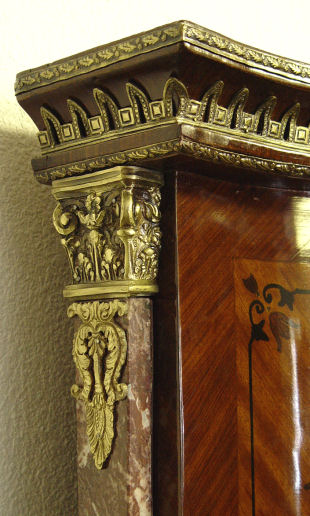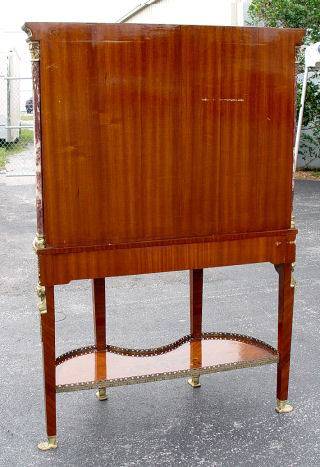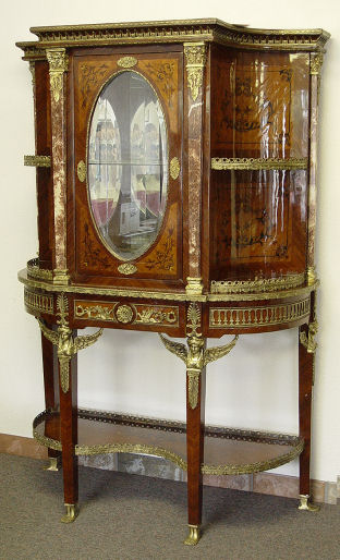 FRENCH MARQUETRY, ORMOLU AND MARBLE DISPLAY CABINET: Glass front center door. Mirror and glass interior. Decorative features include pink marble columns, winged masquerons, rich in marquetry and ormolu. 7''h. x 48''w. x 19''deep.