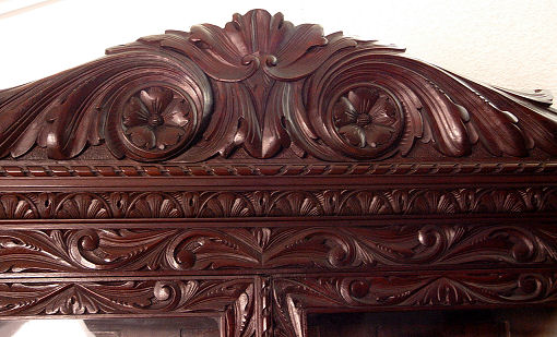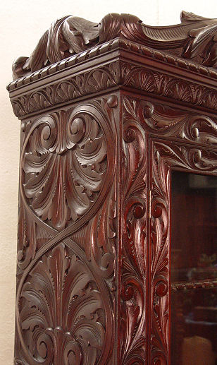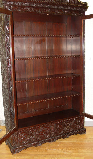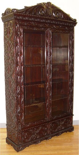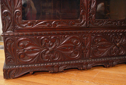 FABULOUSLY CARVED TO DEATH BOOKCASE CABINET: Late 19th C. Virtually every surface is carved. Double glass front doors, adjustable shelves, two half length drawers across the base. 92''h. x 48''x 15''.