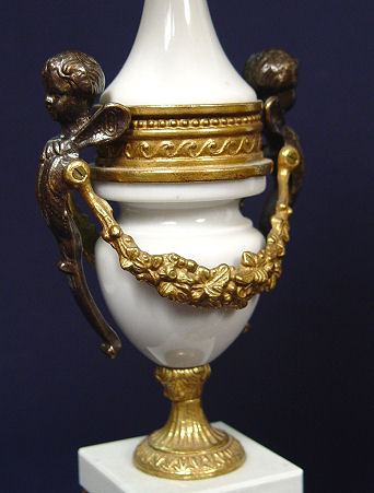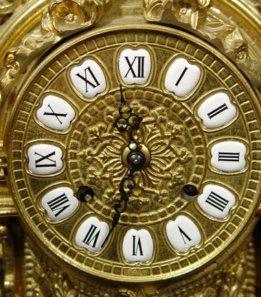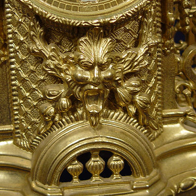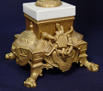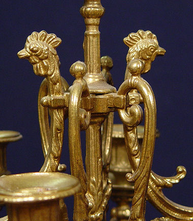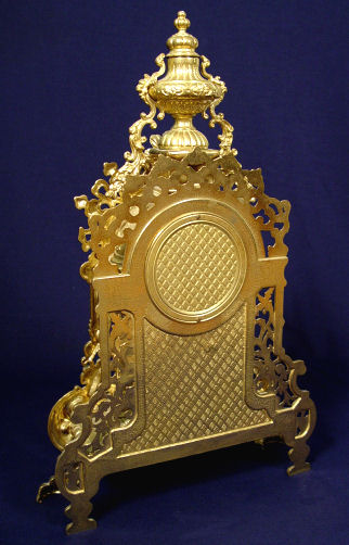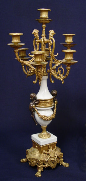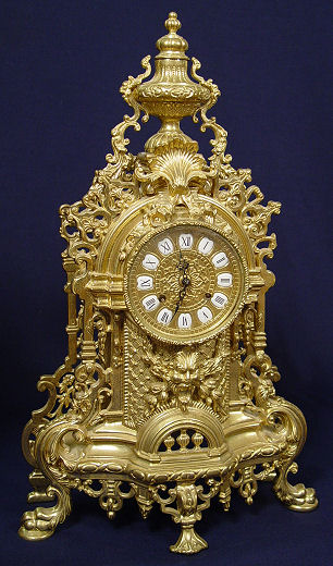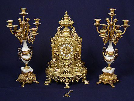 DECORATIVE FRENCH STYLE CLOCK GARNITURE: Ornate brass clock, bell strike, key wind movement, 23''h. The seven light candelabrum are 24''h.