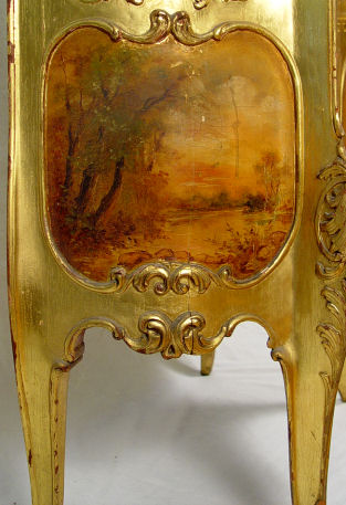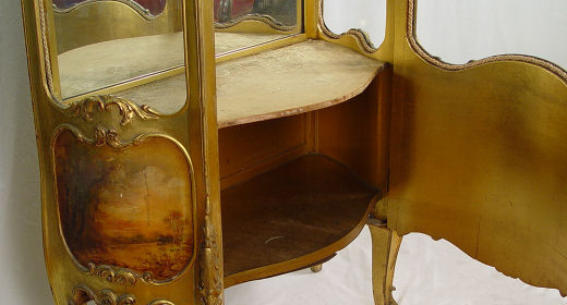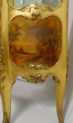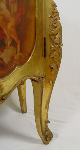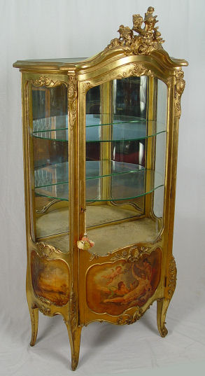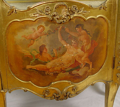 19TH CENTURY VERNIS MARTIN STYLE BOMBAY CURIO: Allegorical panel of putti, glass shelved interior with mirror back. 90''h., x 34'' x 17''.