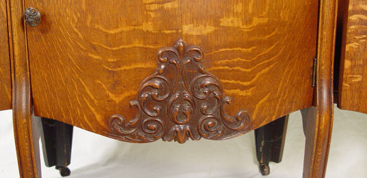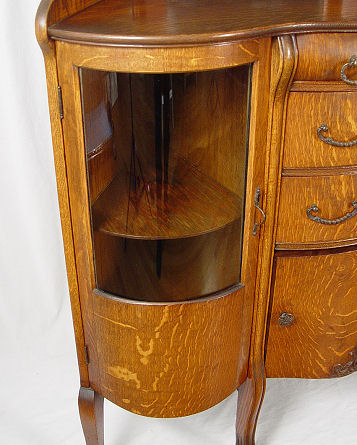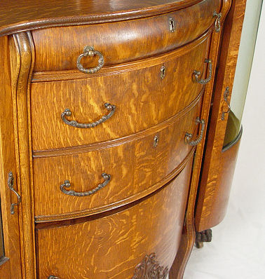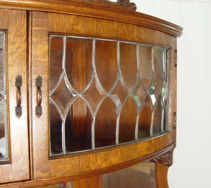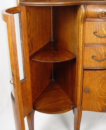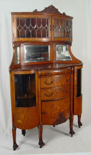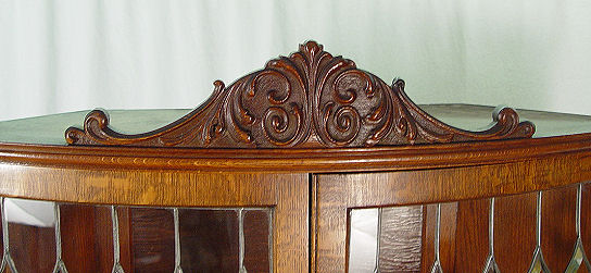 AMERICAN GOLDEN OAK TRIPLE BOW FRONT CORNER CABINET: Rich in details with upper section having a carved center crest, bowed doors of leaded and beveled glass. Beveled mirror backsplash separates the upper from the lower section that is comprised of center of three drawers over cabinet door, flanked by bowed glass front doors. Cabriole legs ending in paw feet. 73''h. 48''w. 21' deep.