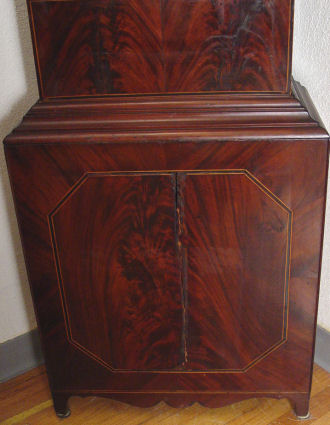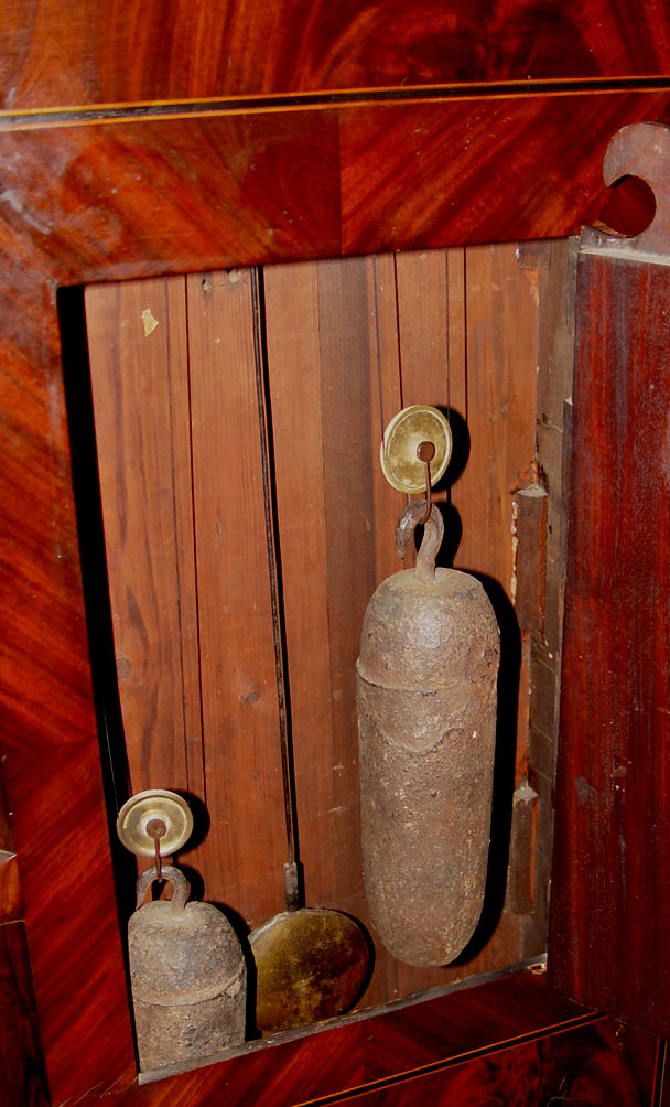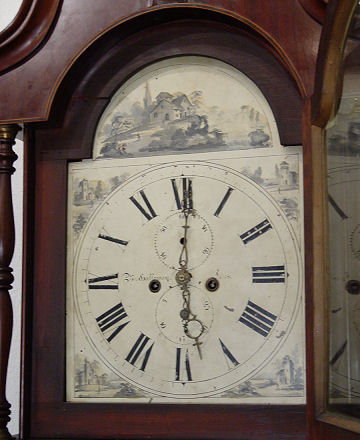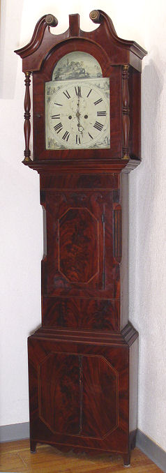 EARLY 19TH C IRISH MAHOGANY BONNET TOP TALL CASE CLOCK: Scenic hand painted tin dial with Roman numerals signed Galloway. Rich flame grain mahogany case. Weight driven. Please call for condition. Est. $2000/3000**