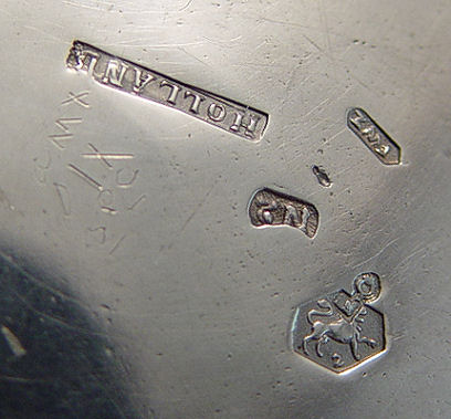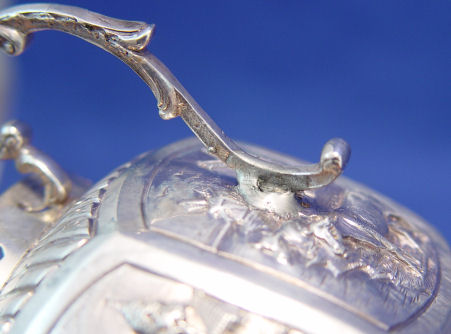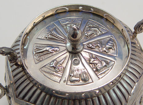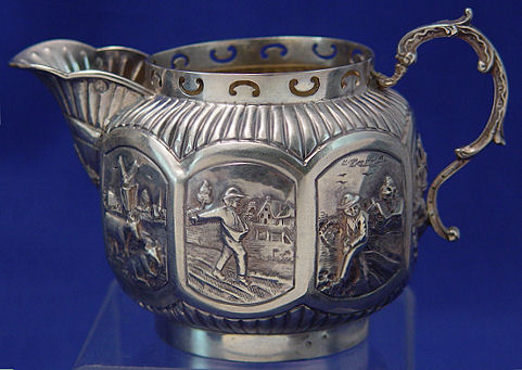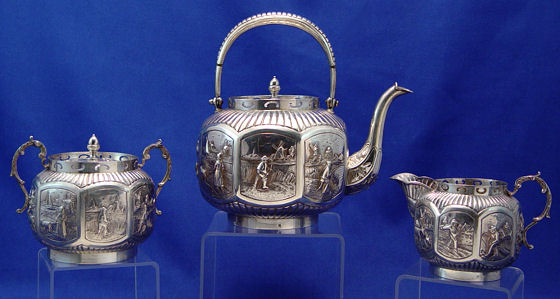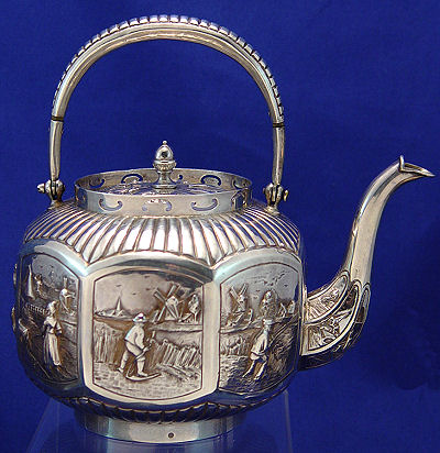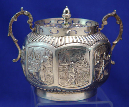 DUTCH 835 SILVER REPOUSSE TEAPOT, SUGAR & CREAMER: Each circled by panels of scenes of life in Holland. Individual size teapot, approx. 7'' side to spout and 7''h to top of handle. Covered sugar 5''w. to scrolling handles, 3 3/4''h. Creamer 4 3/4'' handle to spout and 3 1/4''h. to top of handle. All marked to bottom Holland, Lion and Key, N2, FWZ.