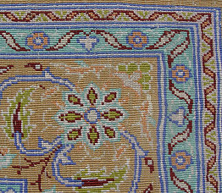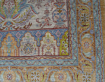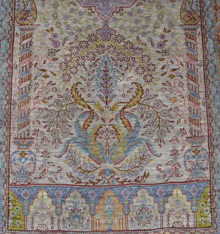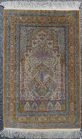 TURKISH ''TREE OF LIFE'' HAND KNOTTED SILK RUG: Approx. 3'7'' x 2'3'' excluding fringe. Gold, greens, blues, and deep iron red. Originally purchased in Turkey for $1200.