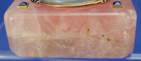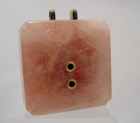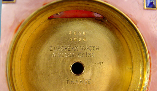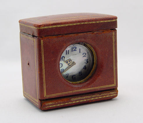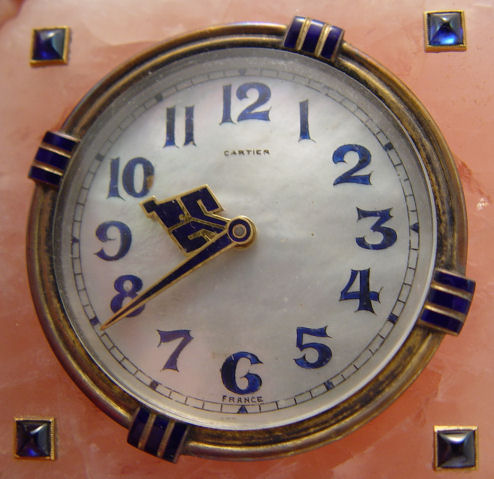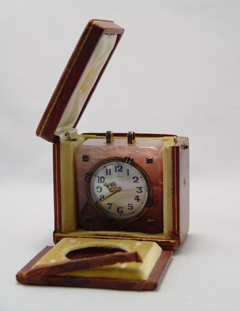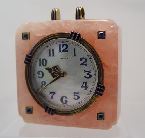 CARTIER ROSE QUARTZ TRAVEL CLOCK WITH KEY AND CASE, Circa 1929: Lovely little clock with Japanese corners, each corner accented with a pointed cabochon sapphire, blue enamel accents to the crystal frame, hands, numbers and supports for missing handle (of these supports on is slightly loose while the other has been glued in place). Mother of pearl face, in good condition marked Cartier and France. Slight enamel loss on numbers, most on zero of 10, no chips felt on quartz slight roughness to bottom from normal wear. Clock works marked E.W.C. Co France 15 Jewel Three 3 Adj. Fab Suisse. Inside back case marked European Watch & Clock Co Inc France 3308 1814. Matching serial numbers to inside ring of crystal frame 3308 1814, serial number to key 1811. Velvet lined leather case in rougher but still usable condition, top latch works side handles? missing. Not currently keeping time, hands can be set, winds but doesn't tic.