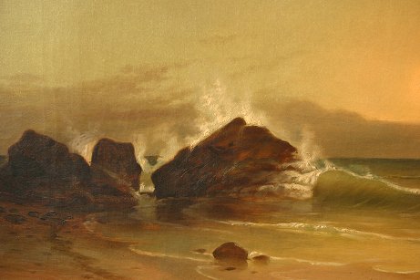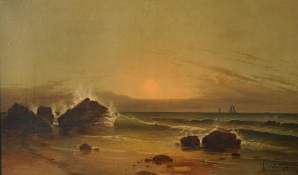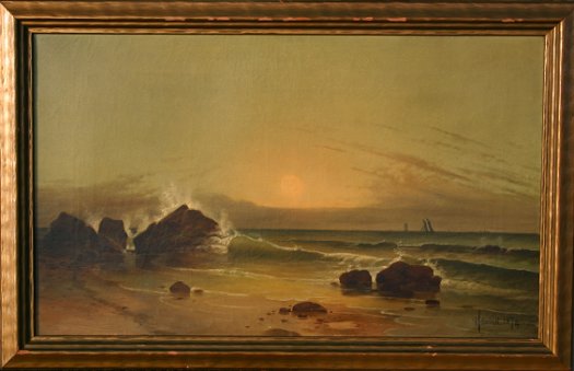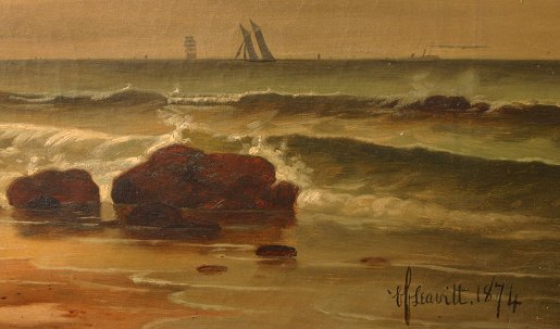 LEAVITT, Edward Chalmers, (American, 1842-1904): Coastal scene at sunrise with ships on a horizon, most likely off the Rhode Island coast, O/C, 18'' x 30 1/2'', signed lower right and dated 1874, encased in a worn gilded frame, 21 1/2'' x 33 1/2''.