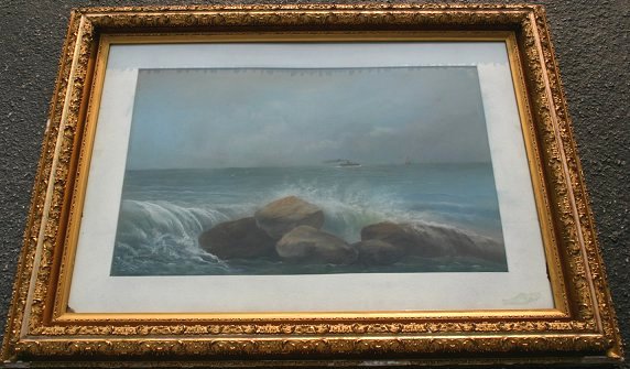 19TH CENTURY AMERICAN SCHOOL PASTEL DEPICTING SHIPPING OFF THE COAST: Sight size 19 1/2'' x 29 1/2'', signed J.Wheeler, encased in period gilded embossed gesso frame with wear and missing gesso, 33 3/4'' x 43 1/2''.