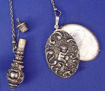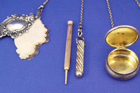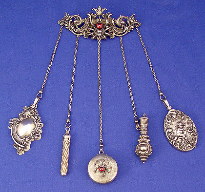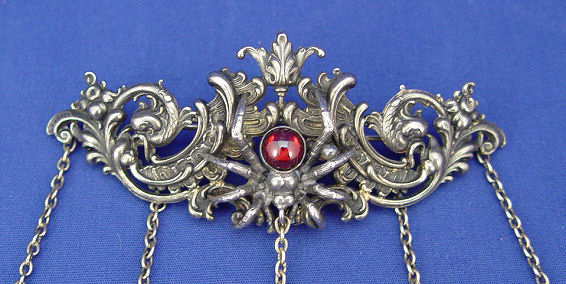 OUTSTANDING STERLING CHATELAINE WITH SPIDERS: The 4 1/4'' sterling pin is centered by a spider with red cabochon body. The five pieces hanging are a mirror with original glass, needle case, pill box with spider on lid, ivory celluloid page note keeper, and a retractable pencil. The longest chain hangs 8''. Truly a vintage piece. Each of the dangles is marked sterling.t