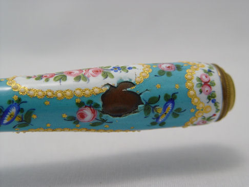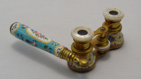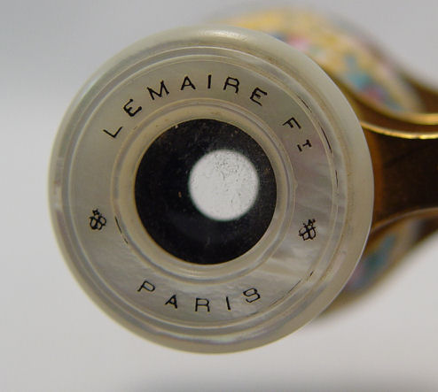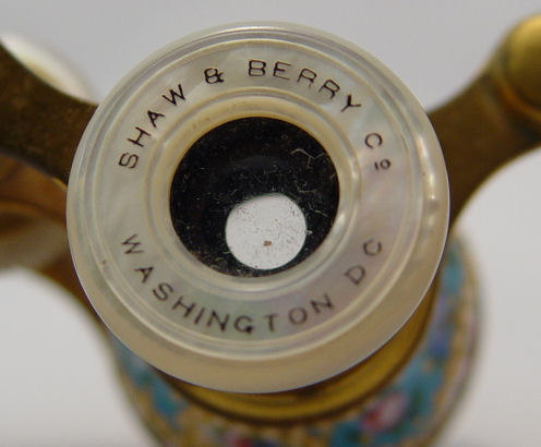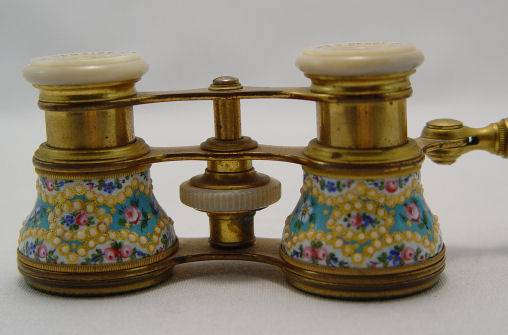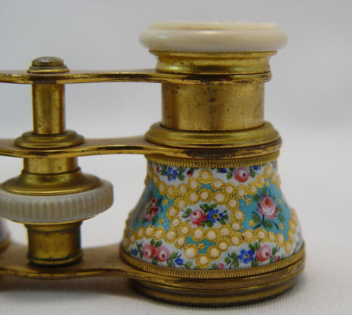 LEMAIRE PARIS FRENCH ENAMEL OPERA GLASSES: Heavily enameled in floral and beaded design. The eye pieces and focus wheel are mother of pearl. This particular pair was labeled for Shaw & Berry Co. Washington DC. Please note the some loss of enamel on the handle.