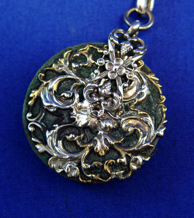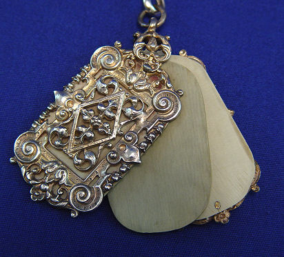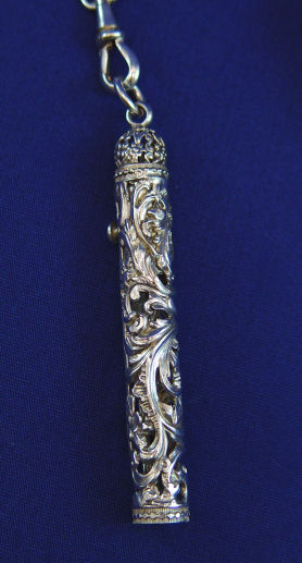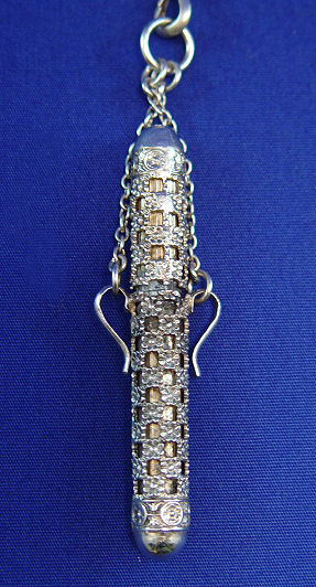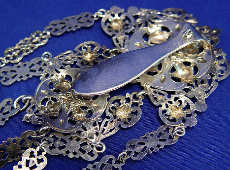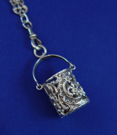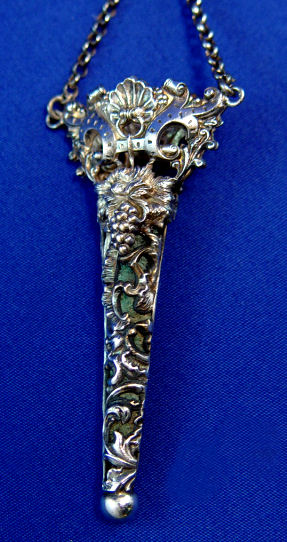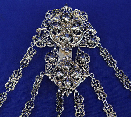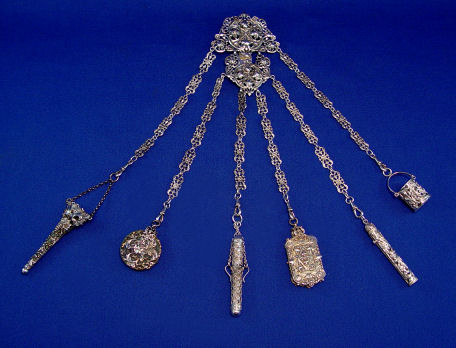 SILVER SEWING CHATELAINE WITH ATTACHMENTS: Ornate repousse belt clip with 6 chains and attachments- the thimble bucket, aide memoire, needle case, pin cushion, scissor sheath. Silver content unknown. The clasp is 3''w., in its entirety the chatelaine is 13''l. No hallmarks or stamps.