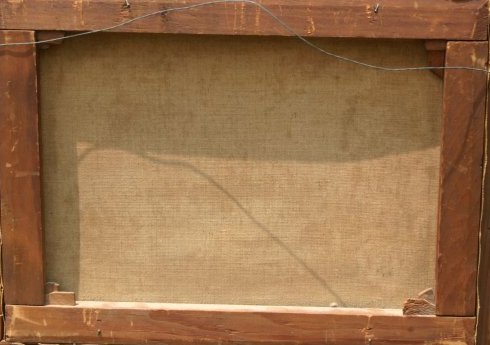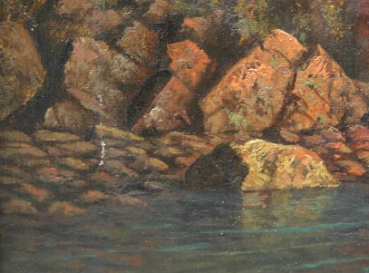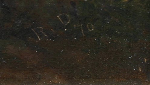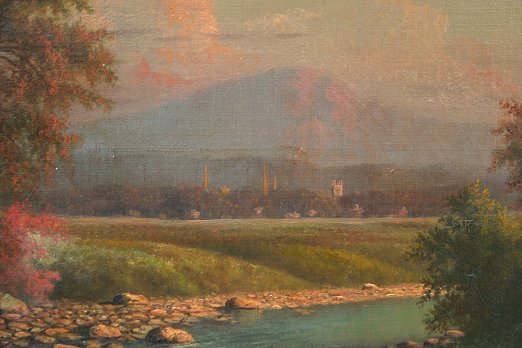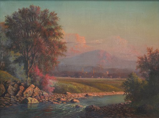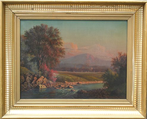 HUDSON RIVER SCHOOL STYLE 19TH CENTURY LANDSCAPE: Depicts a stream with village and mountain range in the distance, O/C, 12'' x 16'', monogrammed ''RD'' lower right and dated '70, encased in a gilded period frame with wear and damage, 17 1/4'' x 21''. One of two in the sale.