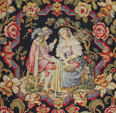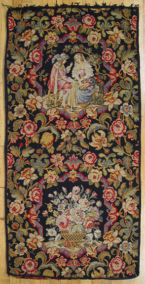 EXEMPLARY NEEDLEPOINT & PETIT POINT TAPESTRY: Hans worked black needlepoint ground with petit point flower filled jardiniere and a courting scene. Black binding. Yarn loops have been added for a dowel bar. 57'' X 29''