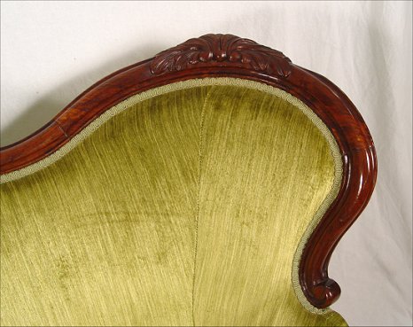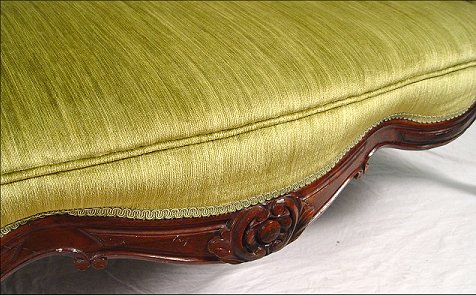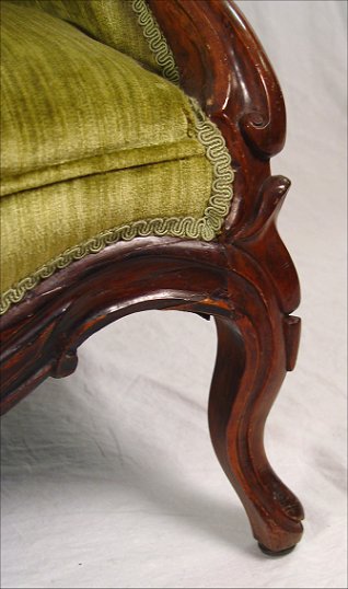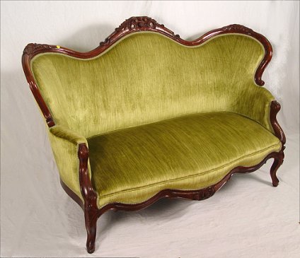 ROCOCO REVIVAL VICTORIAN CARVED SETTEE: Serpentine skirt, flower carvings along the top rail. Green velvet upholstery, 62'' l. x 37'' x 22''.
