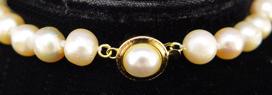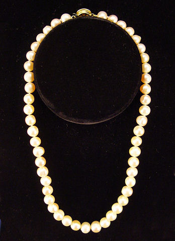 16'' STRAND OF CULTURED PINK PEARLS: Double knotted string of 7 to 9mm cultured fresh water pearls with a soft rosy glow, simple metal clasp with faux pearl top. Approx. 39 grams. Sold with current insurance appraisal stating Retail Replacement cost of $850.00.