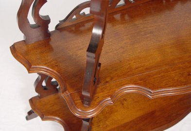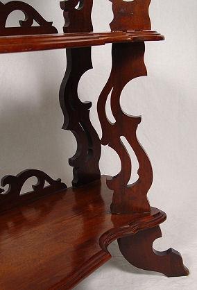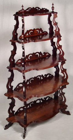 19th C VICTORIAN WALNUT ETAGERE: Pierce carved back splash and supports. 5 shelves graduating in depth and length. 61 1/2''h. x 40'' x 15'' overall.