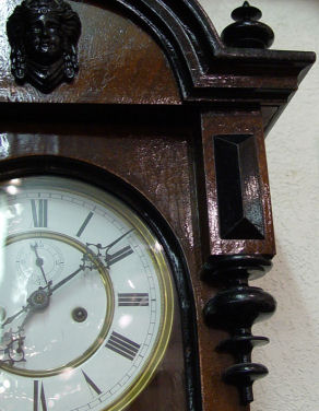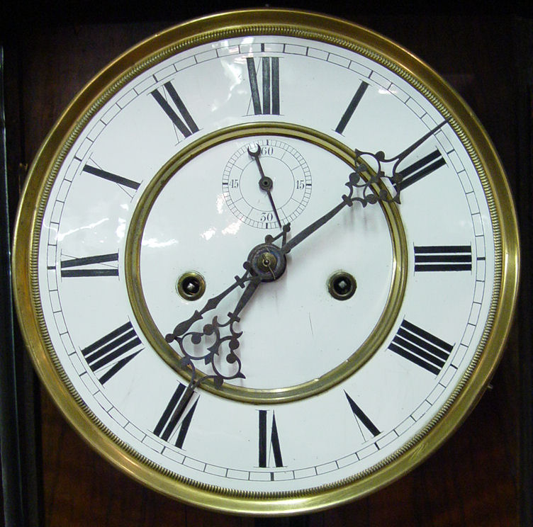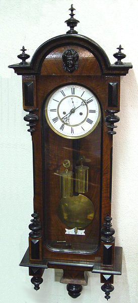 VICTORIAN REGULATOR WALL CLOCK: Crank wind, weight driven, gong strike movement. The mahogany case is in refinished condition. Appears to be in good working order. 42''h. x 13 1/2'' x 6 1/2''.