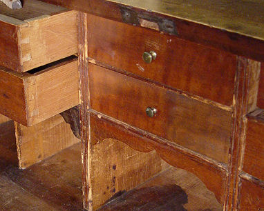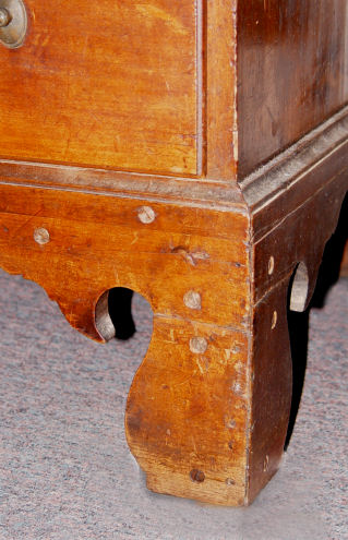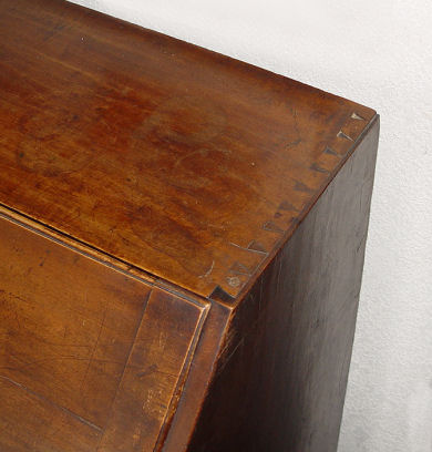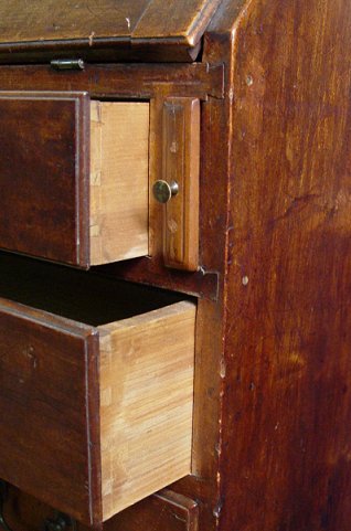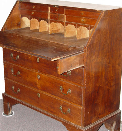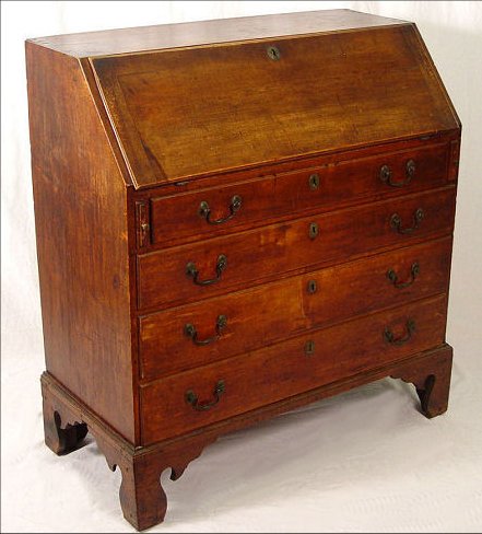 PERIOD CHIPPENDALE SLANT FRONT DESK: All original including hardware and interior. Tall shaped bracket feet. Dovetail construction, even across the top board. Paneled back. One front leg is reinforced with screws. Approx. 43 1/4''h x 40 1/2''w x 20 1/2''d.