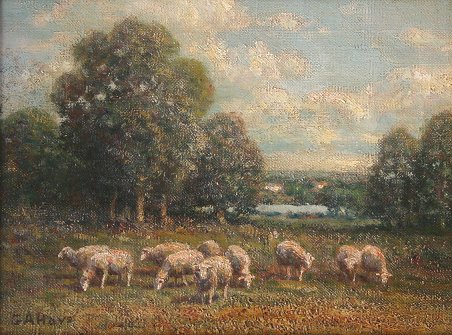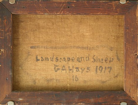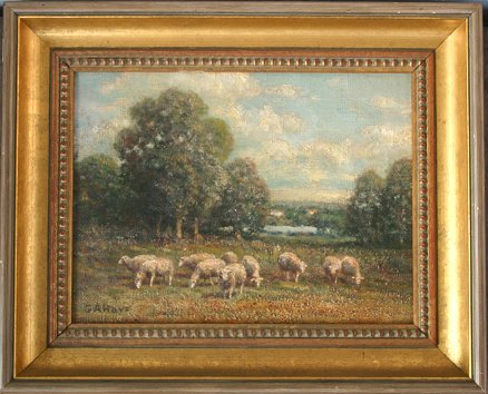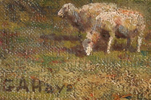 HAYS, George Arthur, (American, 1854-1945): ''Landscape With Sheep'', O/C, 9'' x 12'', signed lower left, signed, titled and dated verso 1917, encased in later gold frame with wear, 13 1/2'' x 16 1/2''.