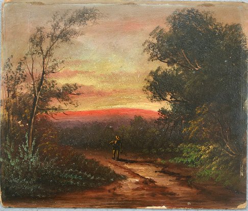 AMERICAN SCHOOL TURN OF THE CENTURY SUNSET LANDSCAPE WITH FIGURE: O/B, 10'' x 12'', no visible signature, unframed.