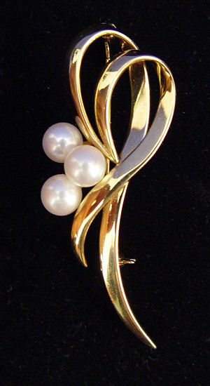 MIKIMOTO PEARL & 18K GOLD PIN: Yellow gold ribbon brooch set with 3 white pearls, marked verso with Mikimoto M and 750, 2''l. and 7.5 grams. Sold with original red presentation box.