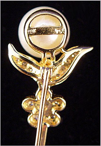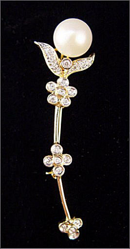 PEARL AND DIAMOND FLORAL PIN: 10mm white pearl blossom on a 18k yellow gold stem with diamond encrusted leaves and smaller flowers, marked 18k 750, 2 1/4''l., 6.6 grams. Old retail price tag $1550.00.