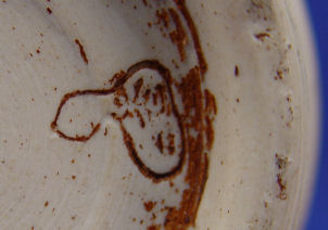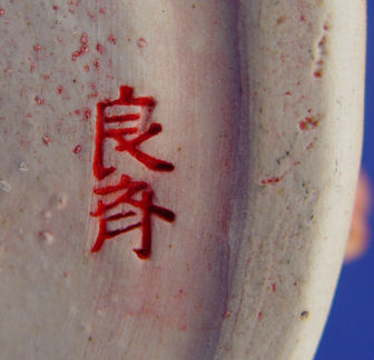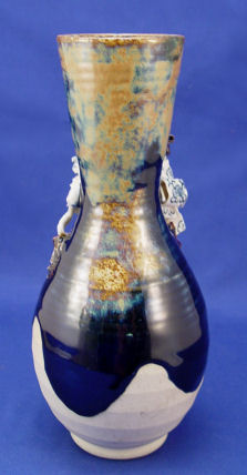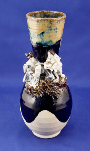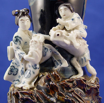 LARGE JAPANESE SUMIDA POTTERY VASE: High relief glazed figures of mother with infant and child riding a toad. The figures are dressed in blue and white garments. 11''h. Impressed signature on underside.