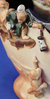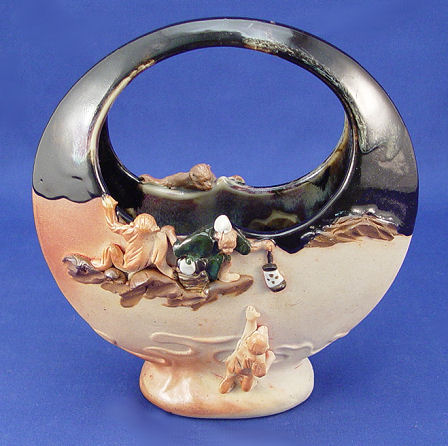 JAPANESE SUMIDA POTTERY BASKET VASE: Relief figures of 4 monkeys, signed in red on the underside. 8 1/2'' tall, 8 1/2''w.
