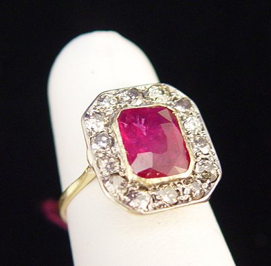 ANTIQUE RUBY AND DIAMOND RING: Emerald cut ruby of approx. 2 cts bezel set in 18k yellow gold surrounded by 14 full cut diamonds, approx.1.5ctw, marked 18ct, size 6, 3 grams. Est. $2500/3500**