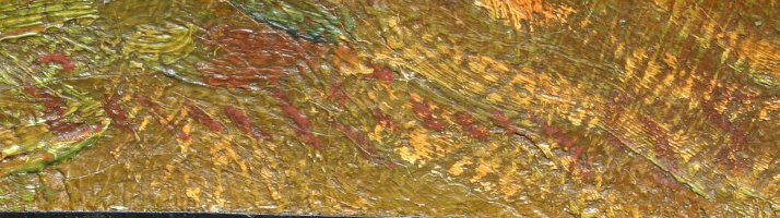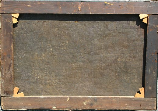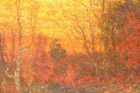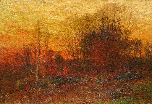 ENNEKING, John J., (American, 1841-1916): Autumnal landscape, O/C, 18'' x 26'', signed lower right and illegibly dated '95?, encased in overpainted period gilded liner with wear, 23 1/2'' x 32''. Signature is dark, but we believe this to be the signature of Enneking. Several pieces have been sold in very similar style to this piece.