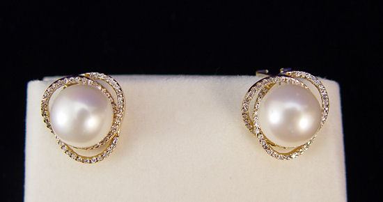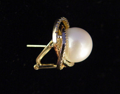12MM CULTURED SOUTH SEA PEARL AND DIAMOND EARRINGS: Show casing pearls of approx. 12mm, surrounded by rings of tiny diamonds, 14k yellow gold omega post mountings. Sold with current insurance appraisal stating Retail Replacement cost of $3,100.00. Est. $775/1000**